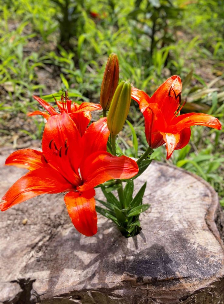 切り株の小さな空洞から顔を出して、耀くように咲いている!元気印のオレンジのユリ❇️✨🌿💛