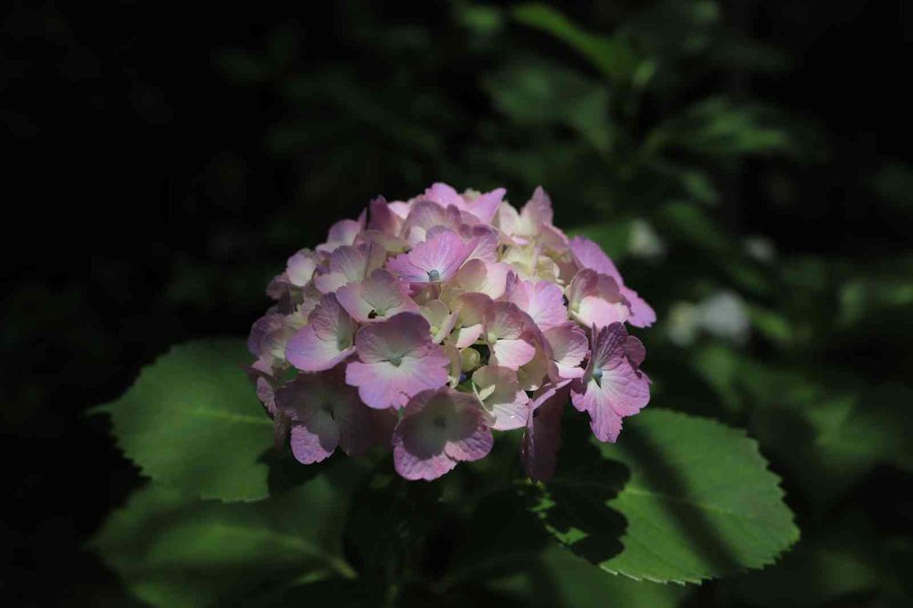 木漏れ日に咲くお寺のアジサイらしい紫陽花🎵