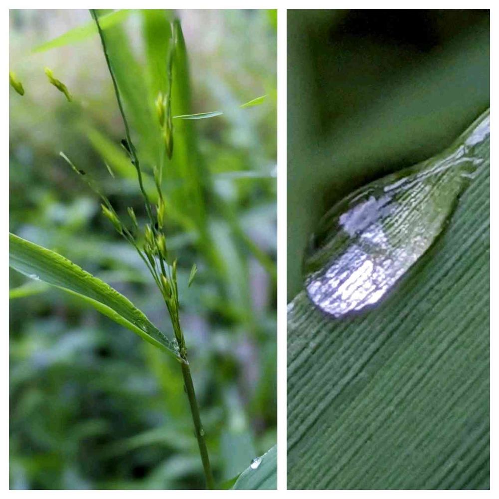 柵からこちらにはみ出して来た偽小判草…もう青い穂が立っていました 葉の上には先程の雨の雨粒が… 笹の葉の上の水饅頭みたい!🎐