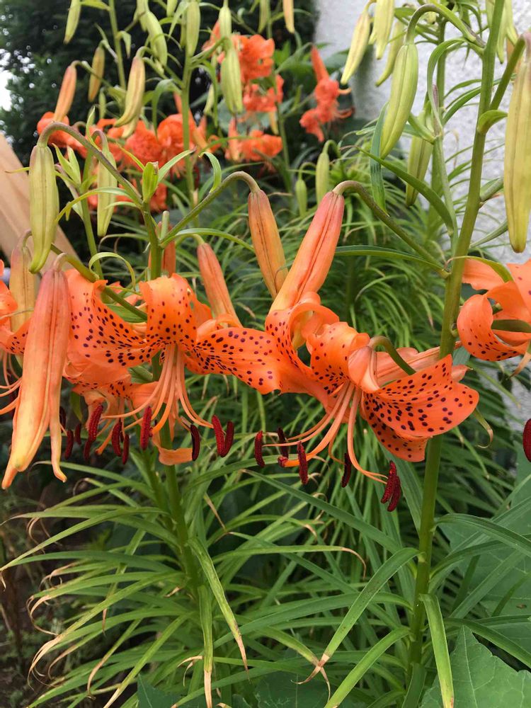 ムカゴの有無で、オニユリとコオニユリを見分けると言うが、遠目には分かりづらい。ここの花壇は毎年、コオニユリだし、姿形もコオニユリに間違い無し。(かな?)