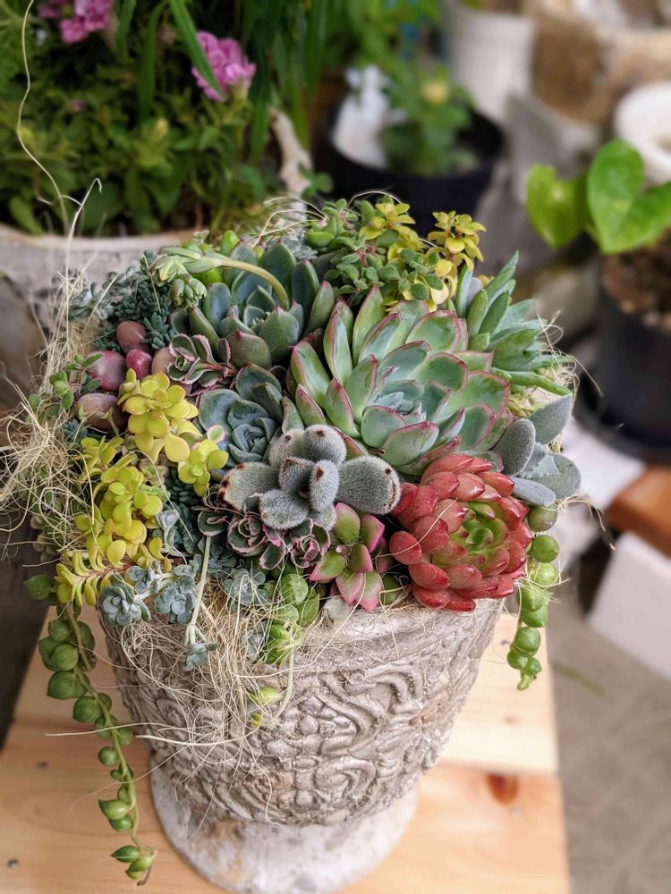 名古屋のフラリエでグリーンネックレスなどの垂れ下がる多肉植物で飾るゴージャスな寄せ植えを作りました⁽⁽ (♡ˊᵕˋ♡) ⁾⁾