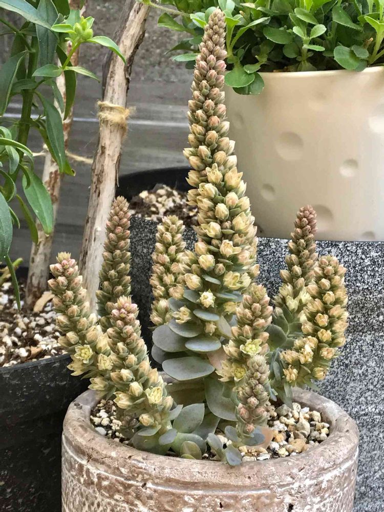 ここで開花待ち❣️見慣れた子持ち蓮華さんの花芽も素敵なオブジェに見えてくる(*´艸`*)ウフフフ💖