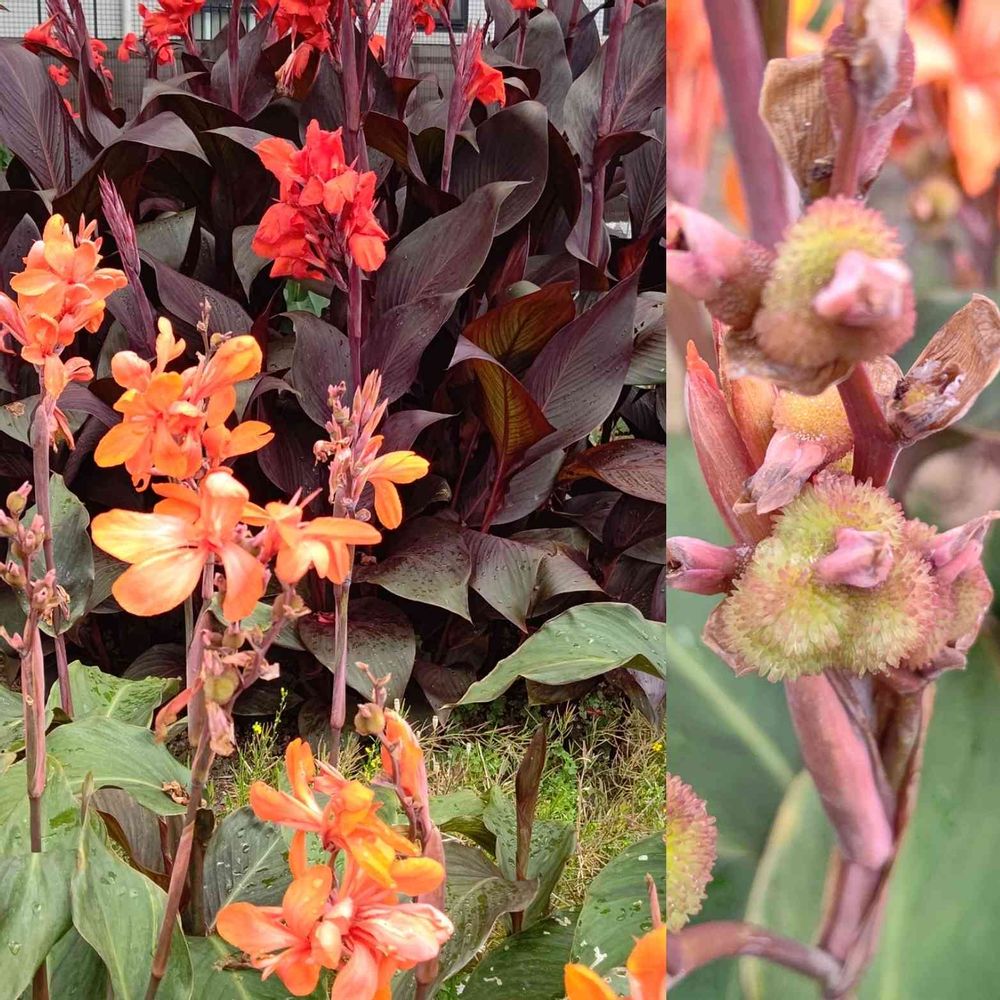 暑い夏にも元気に咲く花、カンナ。こちらの公園のカンナはちょっと早咲き⁉️葉っぱの色も緑と銅葉で、綺麗です。