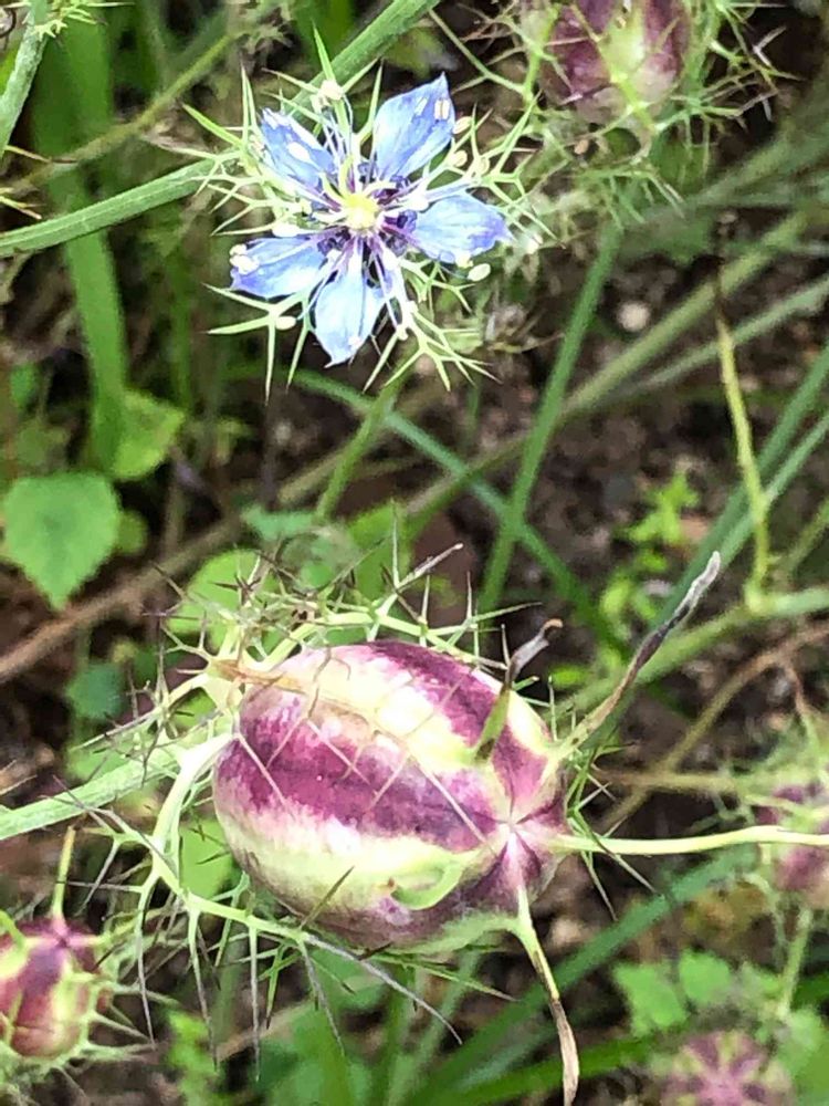鮮やかなブルーが素敵な「ニゲラ」のお花❣️ 今は色褪せて、奇妙な姿の果実と世代交代しています。