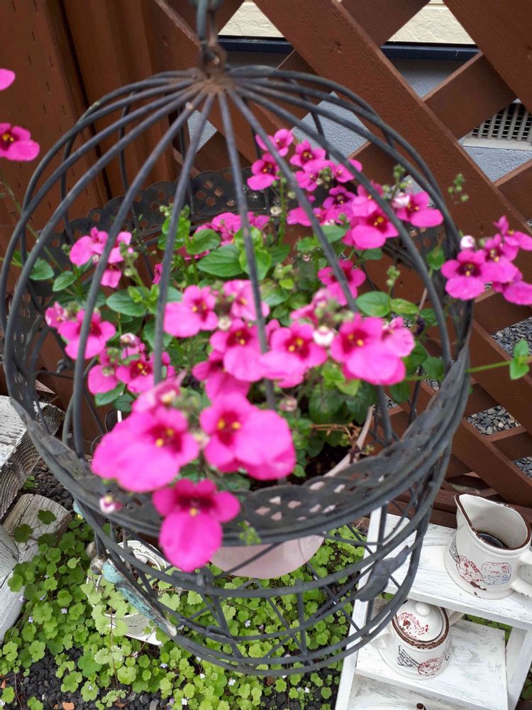玄関まえにも薄いピンクのが咲いてるけど、庭ではローズピンクのが鳥かごの中から飛び出してきました💗