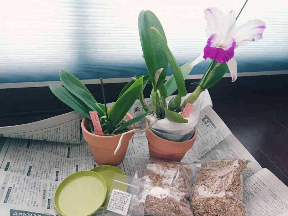 初心者向けの栽培セット買ってみました。株と鉢と肥料と水苔と受け皿で1187円。右のカトレアが届きました。香りがスゴくいいです。花も大きくて驚きました🌼