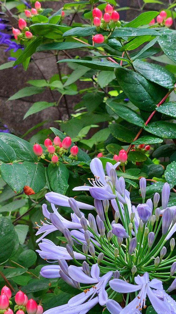 アガパンサスのブルーとヒペリカムの赤は お互いを引き立てあって 素敵ですよ🎶