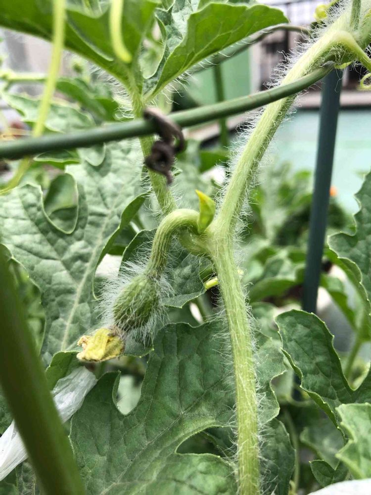 こだまスイカ🍉の雌花、ずっと屋上に上がれなくて受粉出来ず、何個目かな🙄7月になれば自由に屋上上がれるから受粉出来るはず😬
