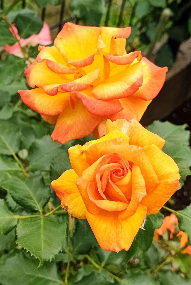 黄色からオレンジに変わる丸弁平咲きのバラ