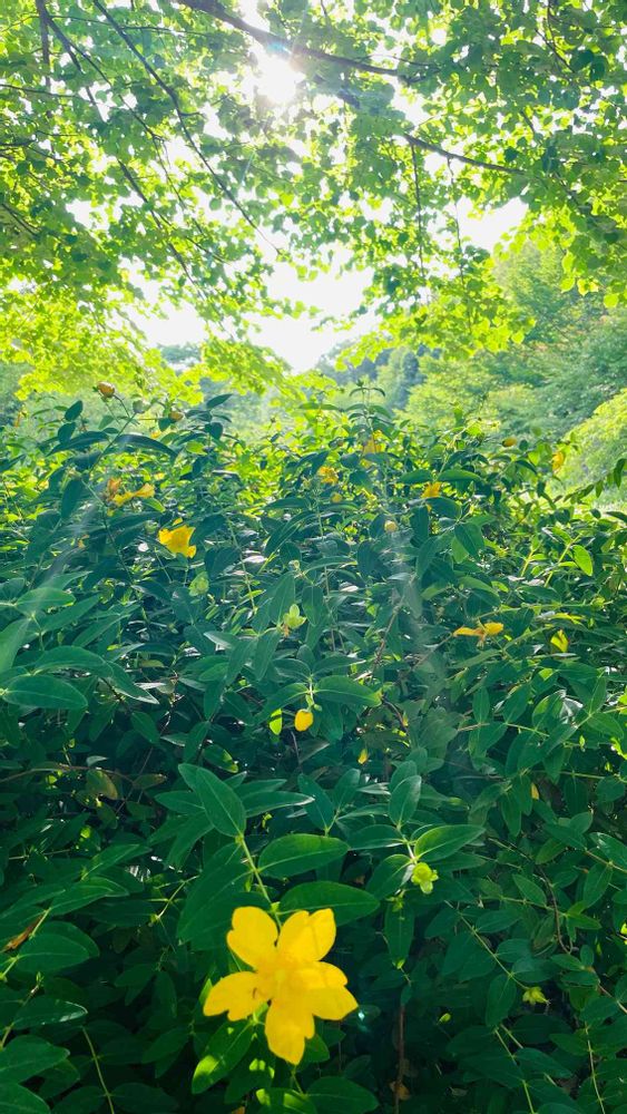 夕方の日差しを浴びる新緑と金糸梅☺️