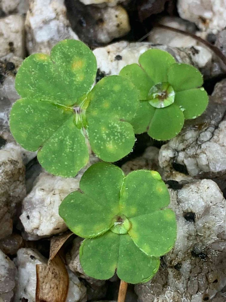 雨上がりの防犯砂利の上にムラサキカタバミ。まあ、次から次へと生えてくれる事。今なら引っこ抜きやすいわ、と頑張ります。雨粒がキラキラ可愛いけどごめんね、抜いてしまいます。