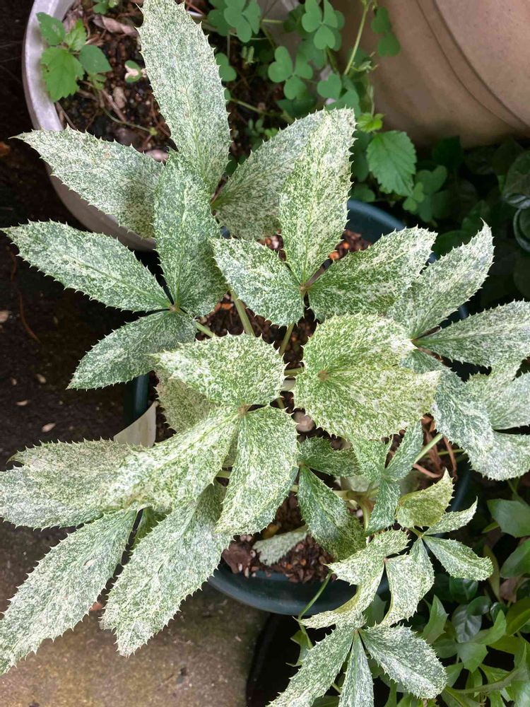 一粒で二度美味しい グリコのようなクリスマスローズ。花が終わったら斑入りの葉で楽しめます。