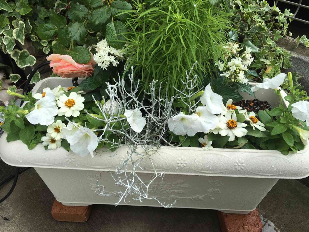 毎年恒例で作っている夏の白い寄せ植え。今年は土量と水切れを考えてプランターにしてみました。時期がまだなのかな、手に入ってないのだけど空いてるところには白いアンゲロニアを植えます😆