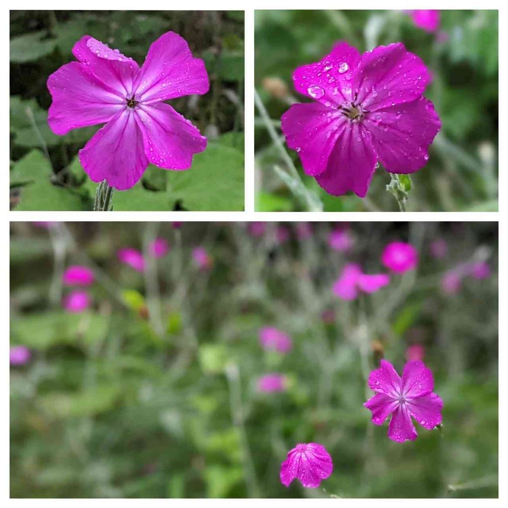 お隣との境界に群生している賑やかなフランネルソウ(スイセンノウ)も雨粒を付けて…