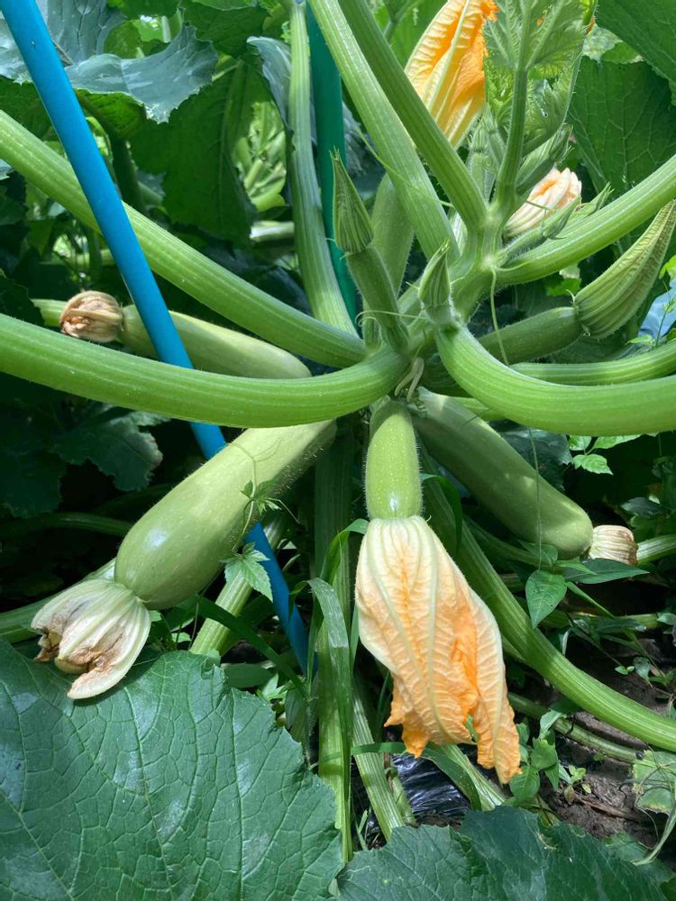 ズッキーニのオリーブヤングマン、今年は梅雨でも雨の日が少ないので、結構自然受粉で実が成っています。