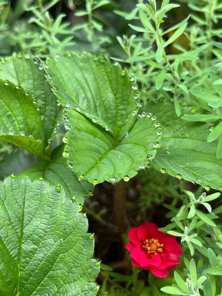 ホントに綺麗!朝露がクリスタルビーズのネックレスみたいに葉の縁を飾ってて…