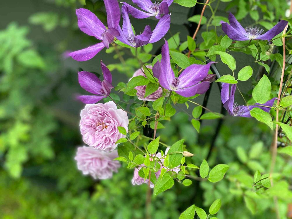 レイニーブルーとパープルのクレマチスのコラボ💗💜