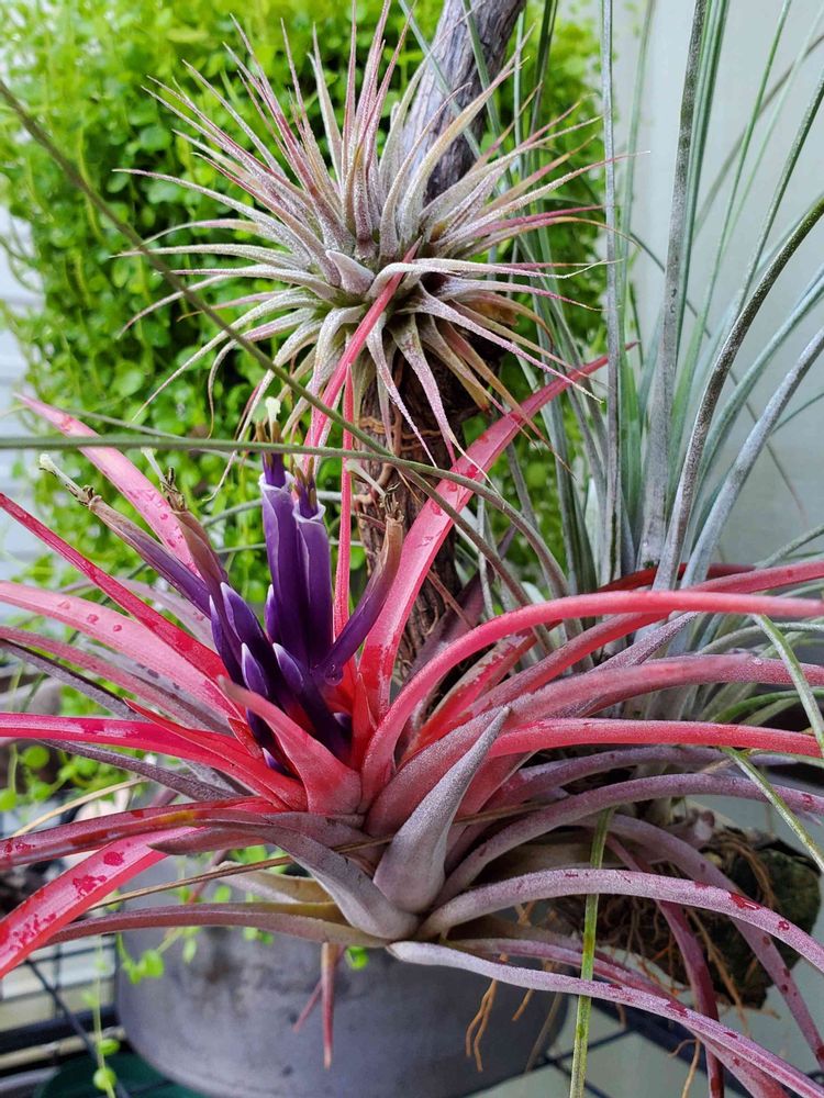 エアプランツが紅葉して咲いたのは初めてです😆みるみる真っ赤になって紫の部分が出てきました❗
