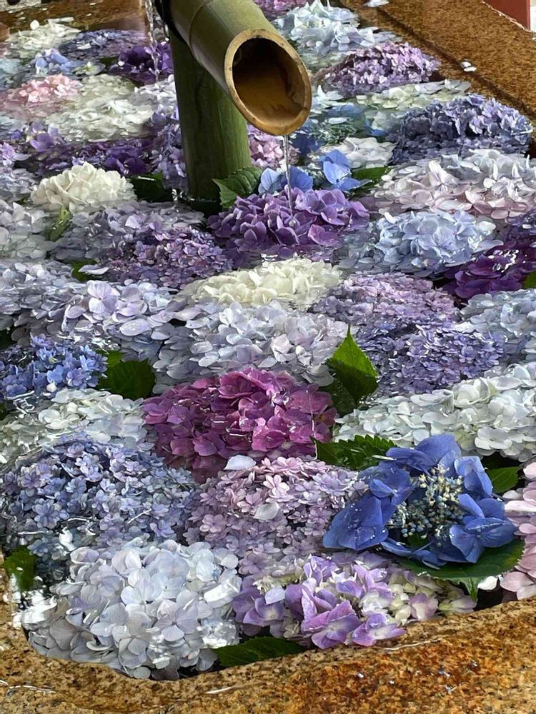 まぁ~ たくさんの紫陽花に覆われてる花手水🌼