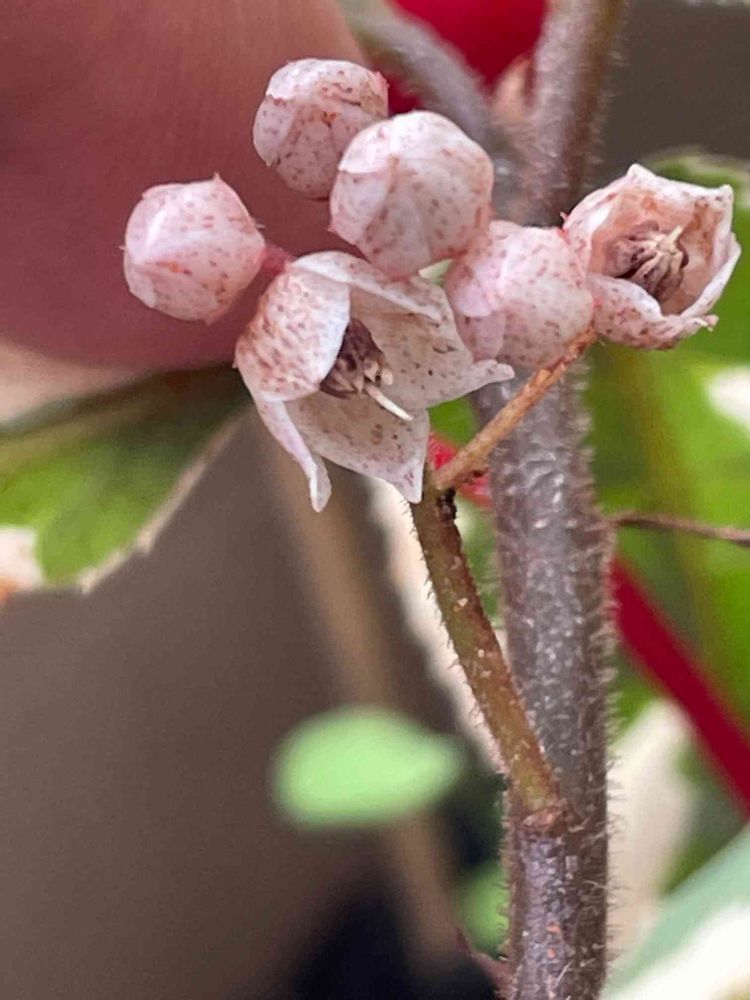 2022ー6ー23(木)曇り☁️ 斑入りヤブコウジのつぼみが開いていました😃 下を向いてる花が写しにくい😅