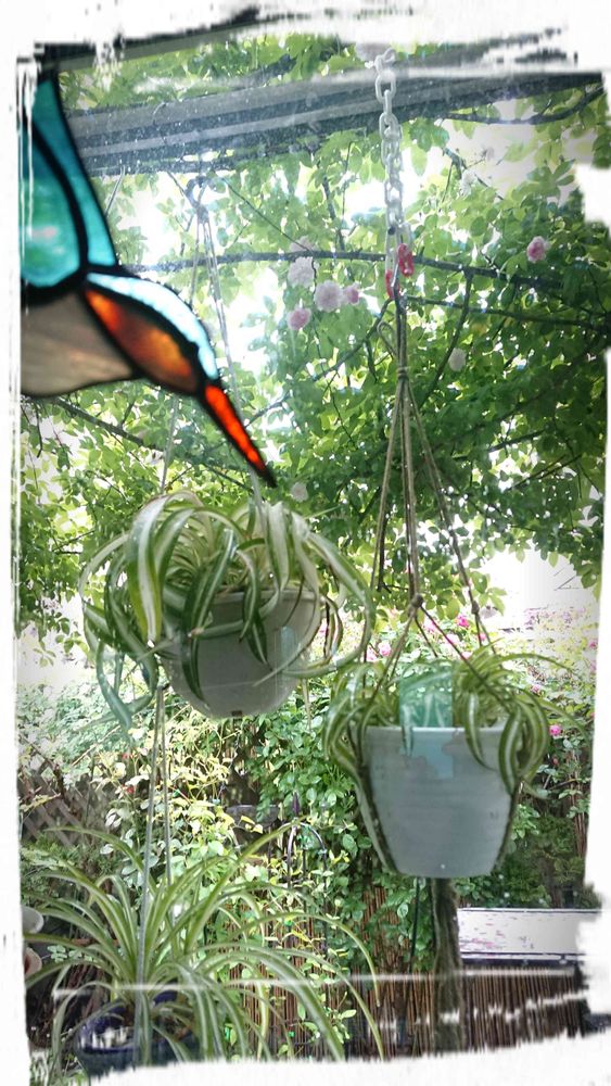 オリヅルランの置き場は、明るい日影‼️でした‼️植え込みに鉢を置いていて、子株がたくさん出て来ていて、土にくっついて根を出していました‼️😆🌿