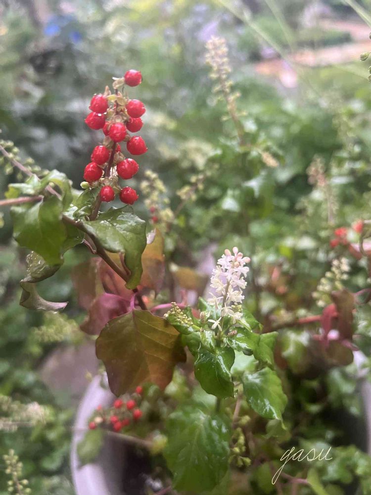 白い花と赤い実をつけ始めたジュズサンゴさん🎶