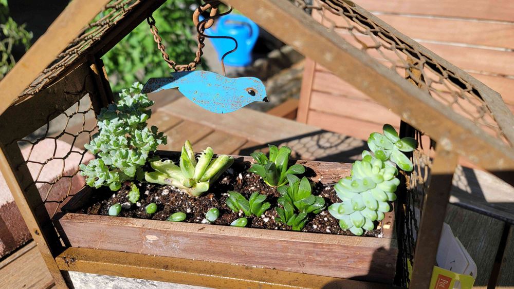 ハンギングバスケットの植え替えをしました😀あまり多肉の種類が無いカナダ。 買い物に行ってみたこと無いのは買うようにしてるのですが、名前がついていないのがおおい😅 左から二番目はフォーカリアだと思うのですが、黄色とみどりの斑模様です。