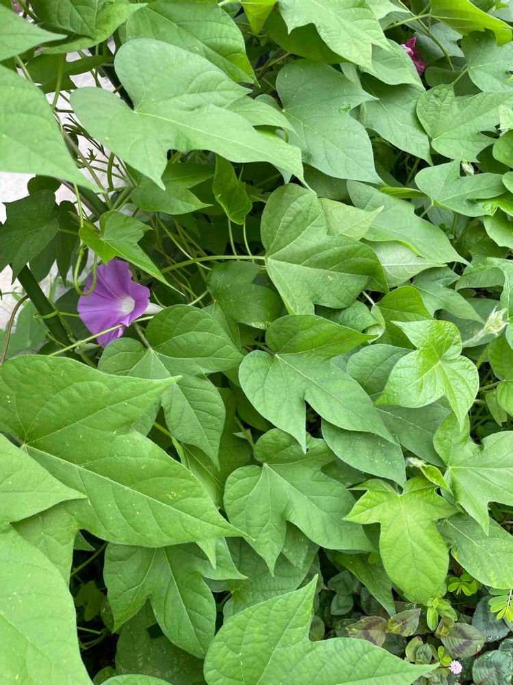朝顔が咲きましたが、隠れるようにして咲いてます。葉っぱを剪定しないといけないのかな?