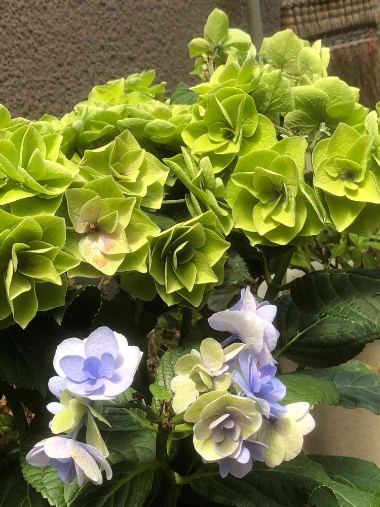 この画像の紫陽花は後の大きなライムグリーンと手前の小さなブルー🫐とライムグリーンの固まりが全部で一株同じ株なのです!!