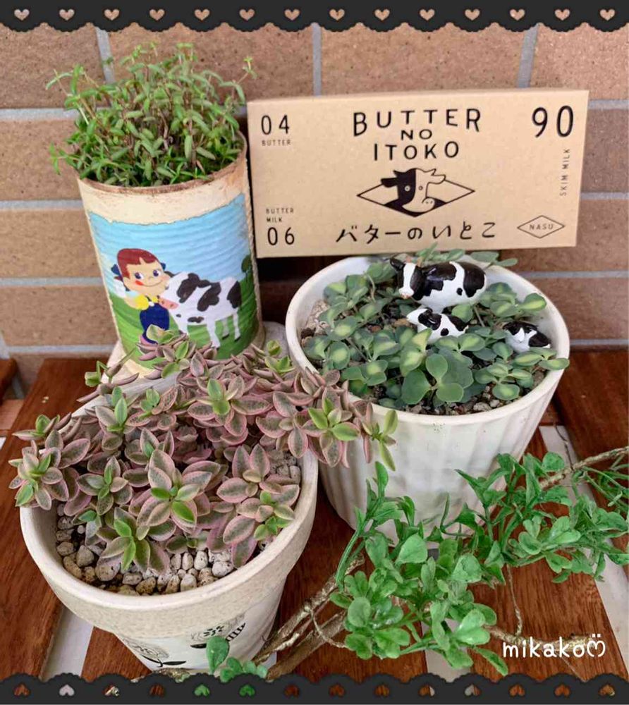 後ろのペコちゃんと牛さんのリメ缶は、
