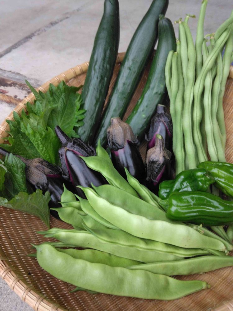 収穫した野菜です🍆🥒🫑……😊😊🐶