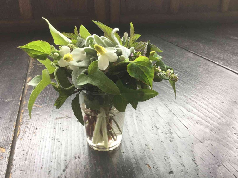 ドクダミの白いがく?が涼やかでアレンジに使ってみました。午後からの集まりに持って行きました。