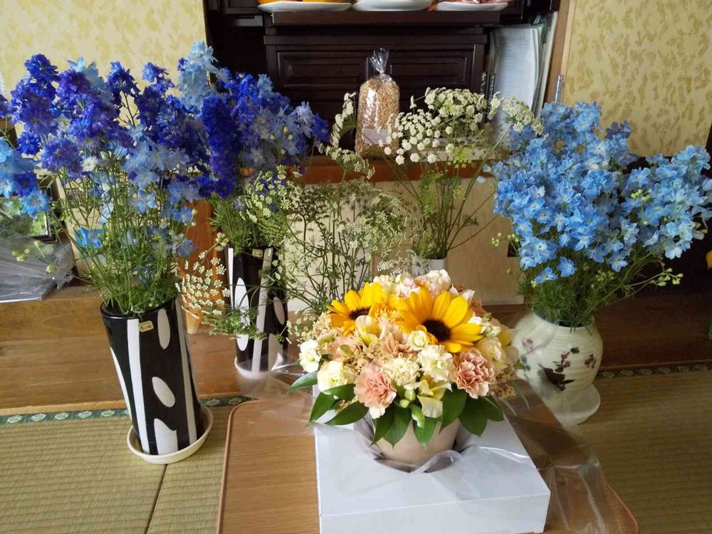 後ろのデルフィニウムとレースフラワーは直売所で購入。この量で¥2000弱‼️安い〜😁