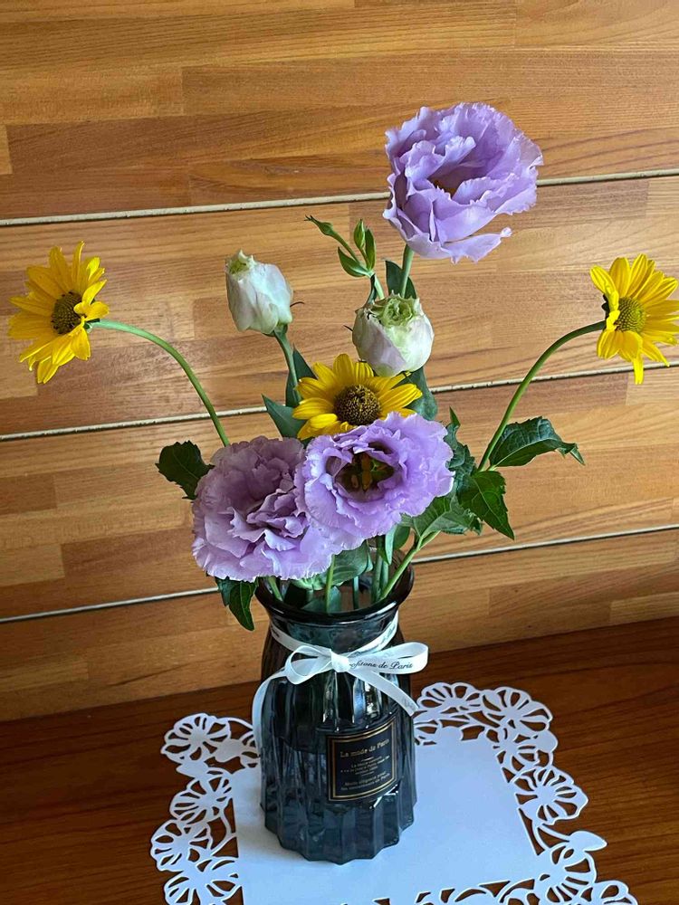 傷んでしまった黄色いルドベキアと、買ったトルコキキョウを花瓶に生けてみました😊