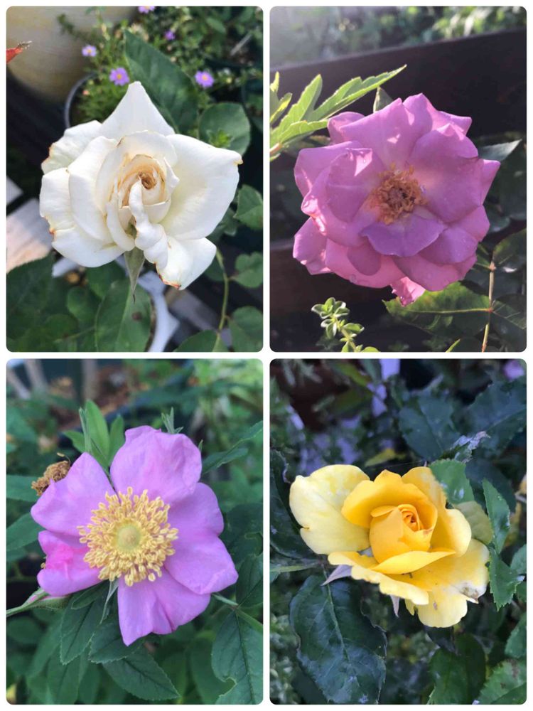 今朝は、エアコン上のアメリカンブルーが😳❓…薔薇たちの中にスッポリと落ちて横向きに😱 でも水分はあったようで 置き直すとたくさんの花で💙🌼何事もなかったように咲いてました(笑)
