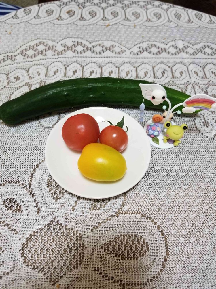 昨日の強風で倒れてないかドキドキでしたが被害なかったよ☀️初収穫のアイコさん。いらっしゃった。相変わらずきゅうりはへそ曲がり(泣)