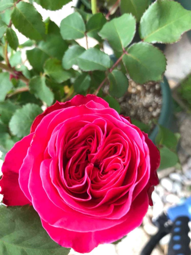 閉店するお店で値下がりしていた中から選んだゆうぜんという薔薇。初めて花を見ます、場所が無いため鉢で育てています。改めて付いていたタグを見ると大輪とありましたが初めてだからか小さめです、クリムゾン色からマゼンダ色そしてパープルにうつろいでゆくとありましたので今はクリムゾン色になるのだと思います、香りはそんなに強くありませんがタグにはバナナ、ピーチ、ミルクをミックスした香りとありました、これからの変化が楽しみです。