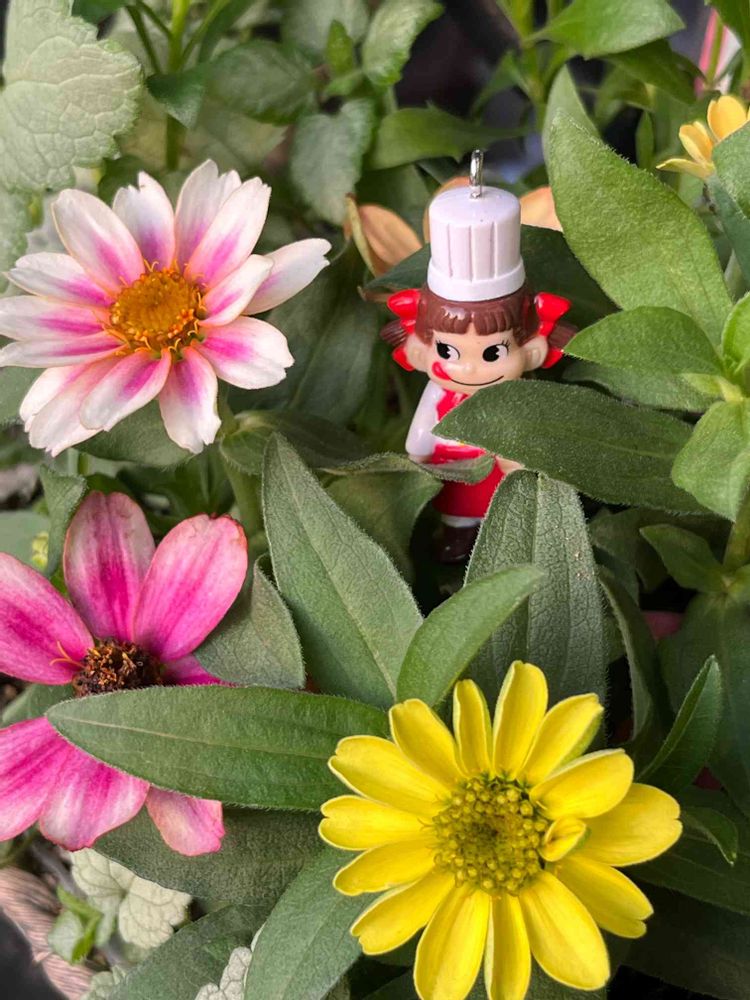 可愛いペコちゃんとジニアで癒されましょうかね~🌸🤍🌼
