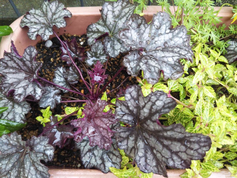 ヒューケラを植えてから新芽が出てきています、高温時期になるとシルバーグリーンがかり低温時期はパープルが強くなるそうです。