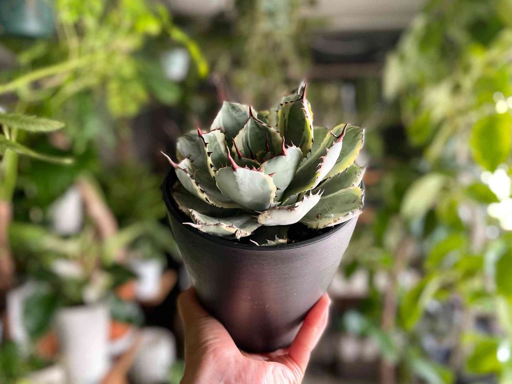 葉のふちに斑が入り、赤茶の棘とのコントラストが美しい個体。#アガベポタトルム吉祥冠錦 が到着しました。