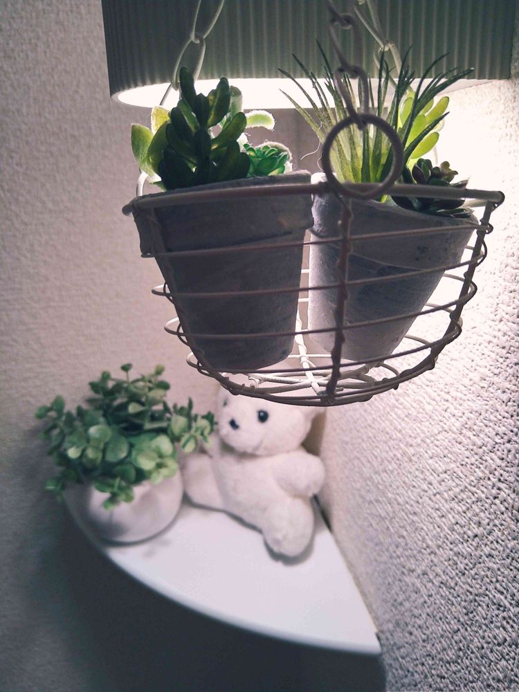 ウチの極狭&窓なしトイレに生きてる子を置くのは忍びなく、ミニミニ多肉のフェイクグリーンを2つ吊るして熊さんぬいぐるみとまん丸ポットのフェイクグリーン🍀を置いてます🐻