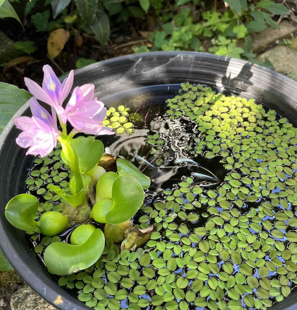メダカ鉢、外の反日陰に置いてみたら、今年は花を見ることが出来ました。鳥避けの網をずらす事にしました。