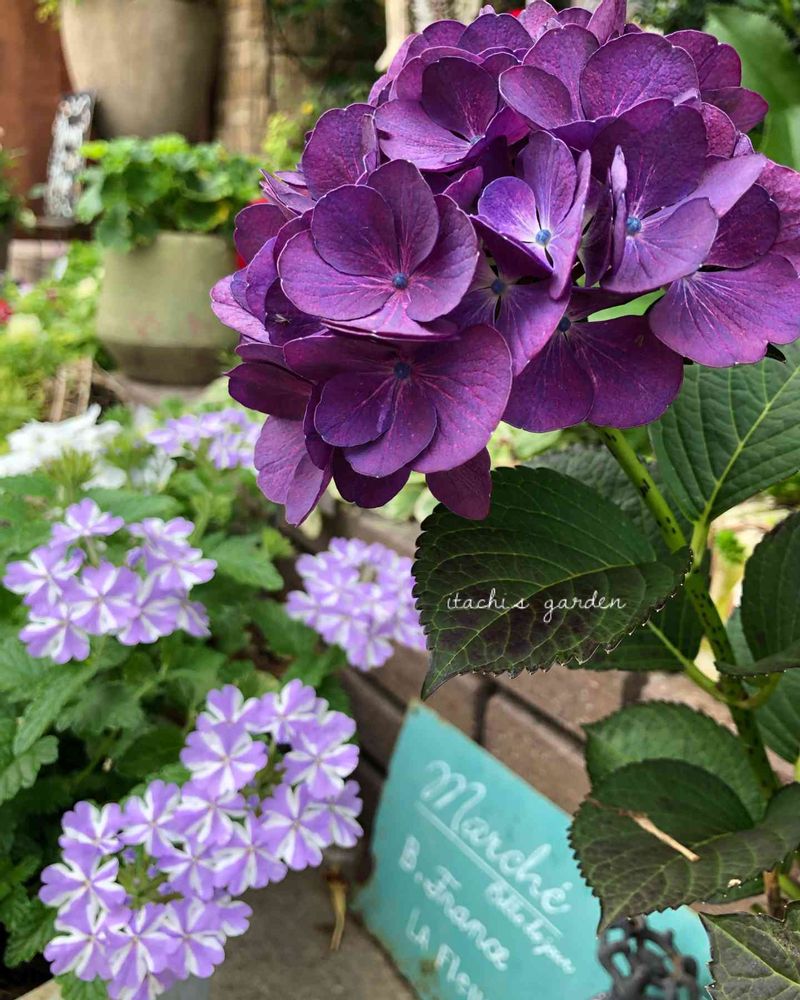 バックの綺麗な葉、ヘデラ?とバーベナの葉、もちろん紫陽花の濃い葉色が濃く深い色目の紫陽花をより引き立てステキですね🤣