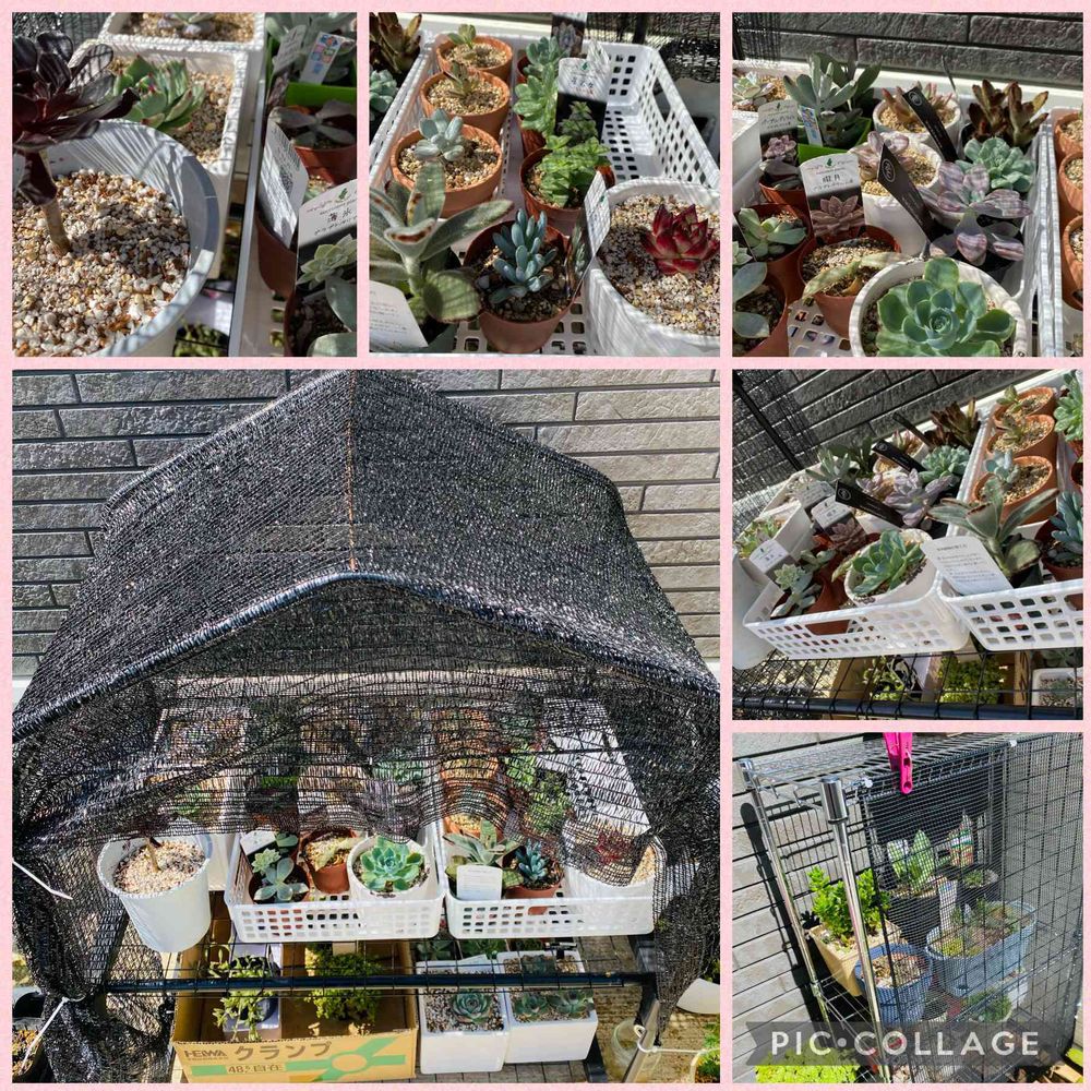 玄関前の北側の壁にビニール温室の棚を持ってきました。そこに100均の遮光カーテンを東側と上にかけてみました。雨が降る時はビニールを掛けようか?悩みどころです。