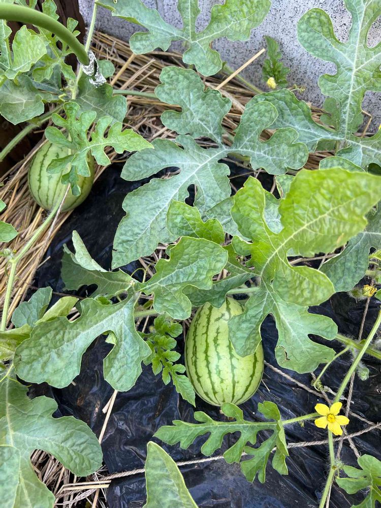 春まで苺栽培していたエリアに小玉スイカ栽培中。急激に実が大きくなってきました!