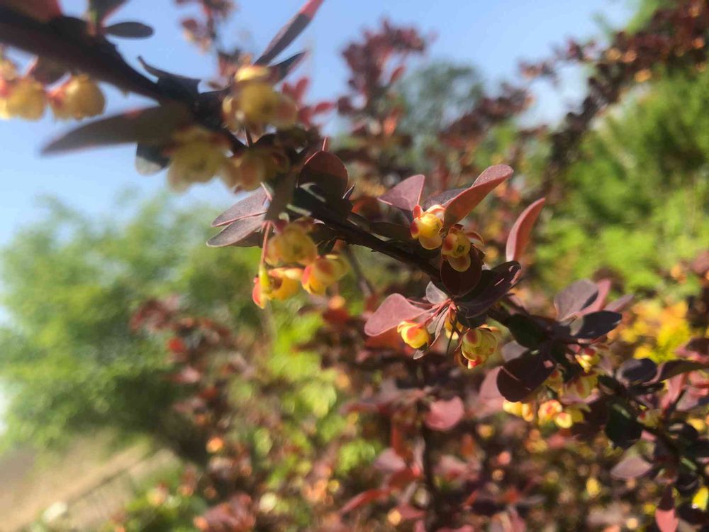 ダークレッドのメギに黄色い可愛い花が咲きました🌼