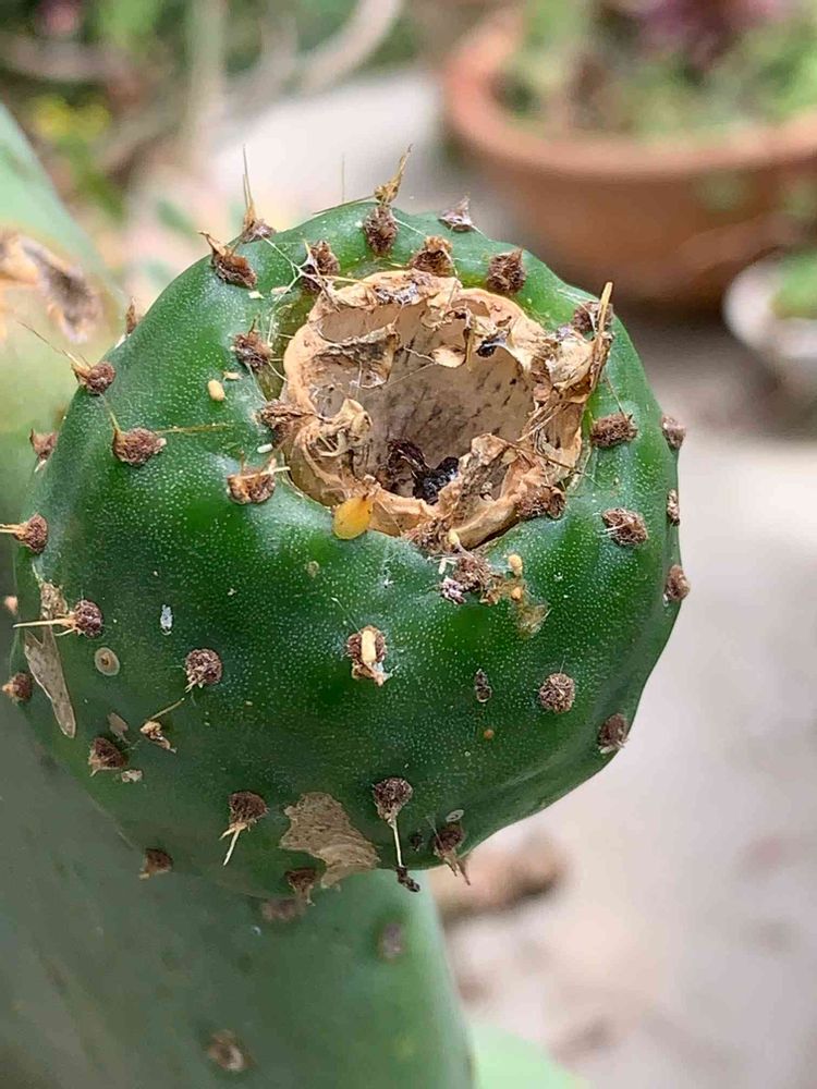 5月29日に投稿した食用ウチワサボテン🌵ノパルの蕾その後。気がついたら、いつの間にかこんな姿に🥲またナメクジにやられてしまいました💦