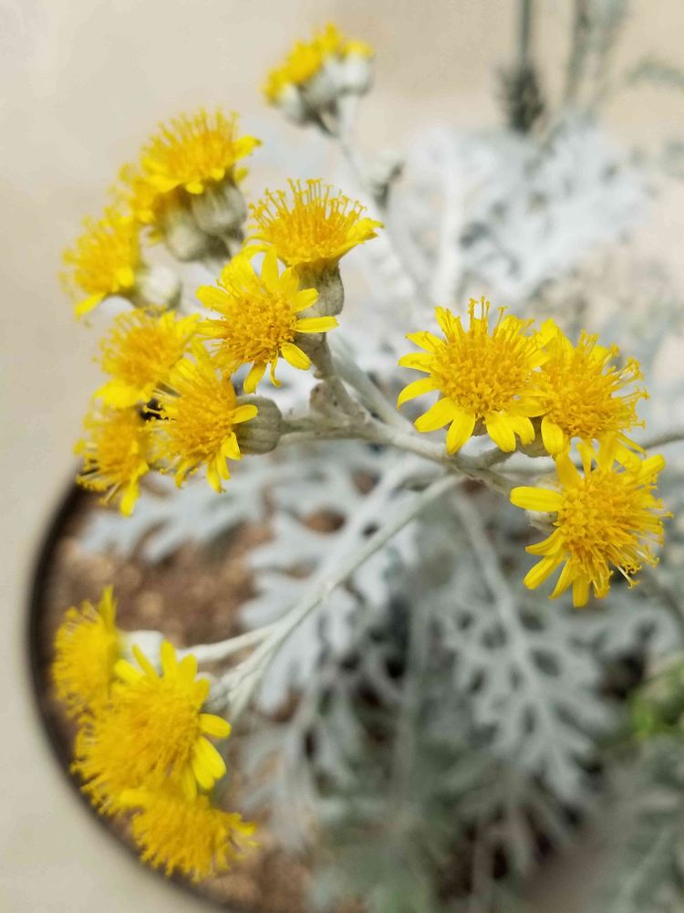 寄せ植の白妙菊の花がやっと咲きました🌼