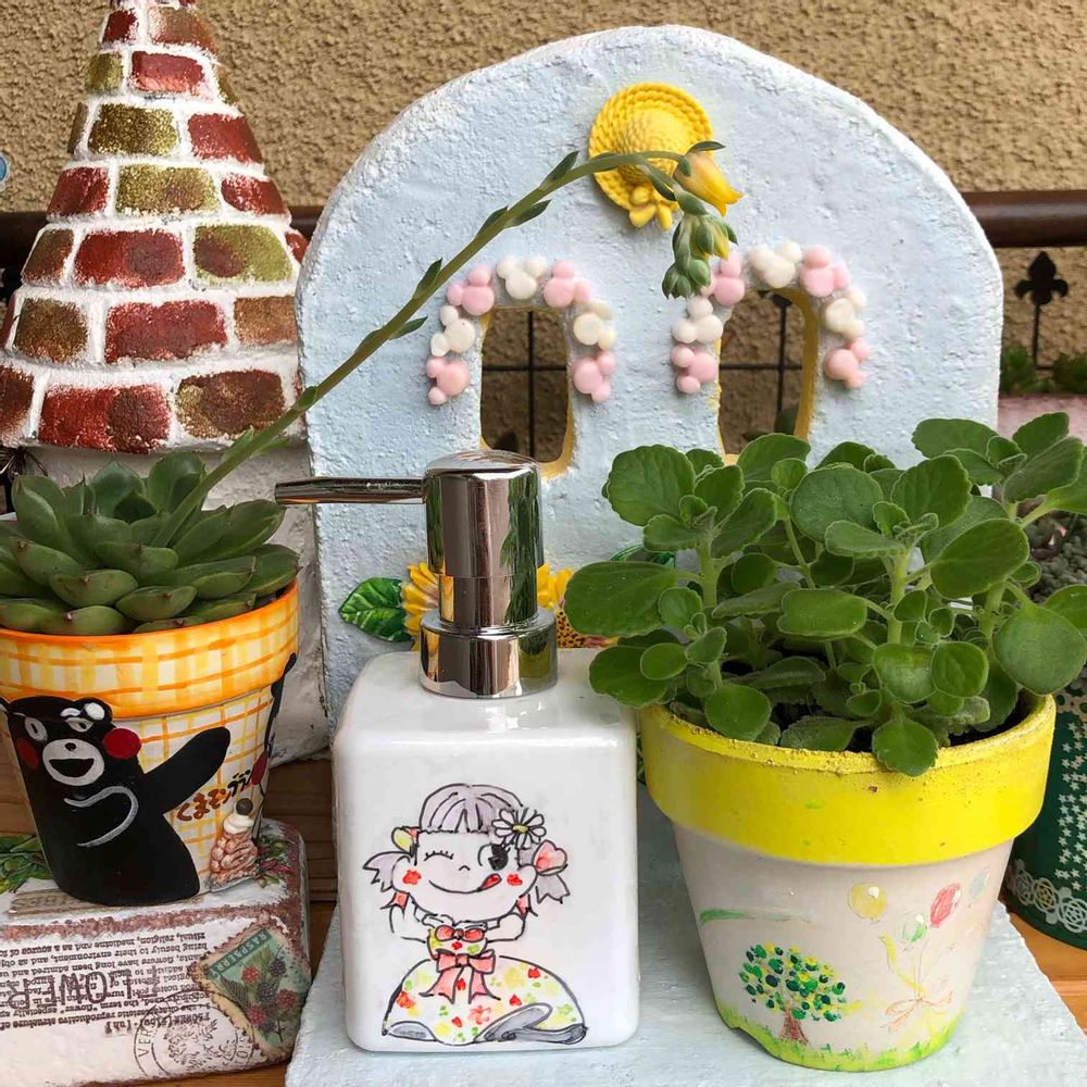 リトルクローバーさんに描いて貰ったペコちゃんポンプとリメ鉢です。希望通りの明るいタッチでしょ☺