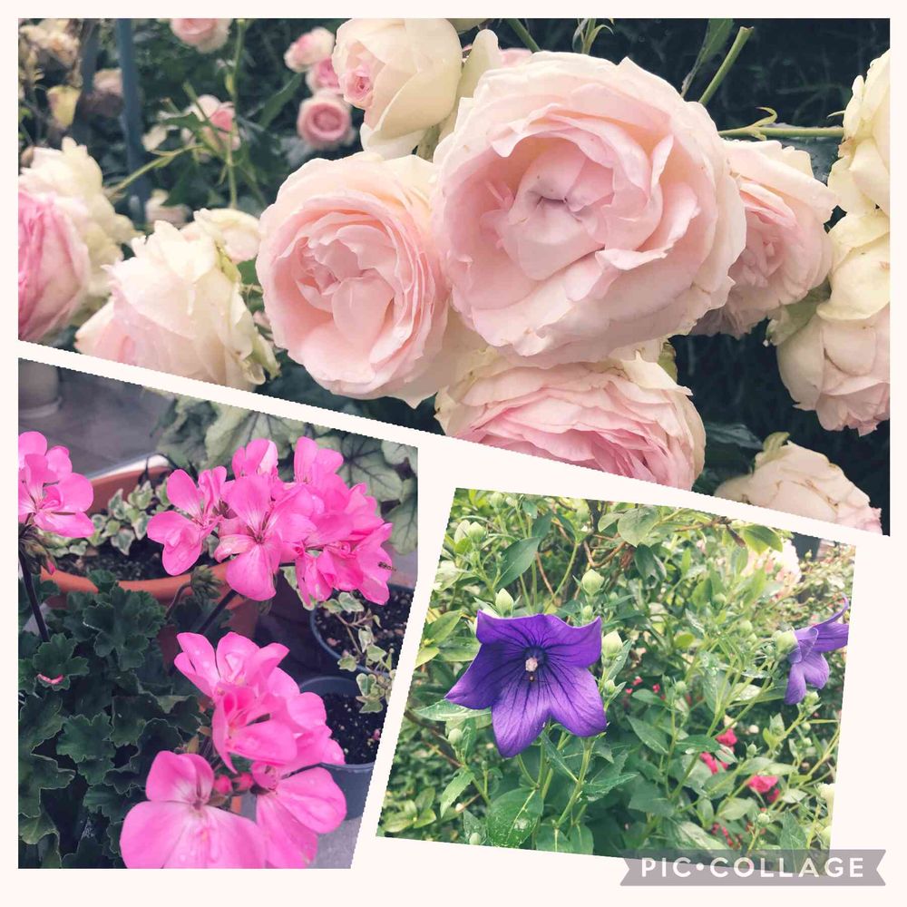 ピエールや桔梗なども、夕べの雨に濡れて重そうでした。薔薇は花房ごと振って雨を落として。 こんな事まで子供達は留守中やってくれないねえ😅 ごめんねと花達に